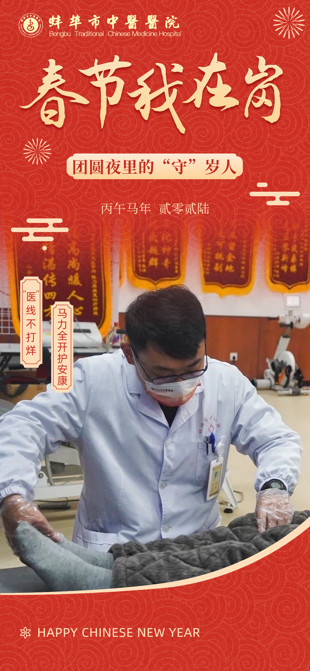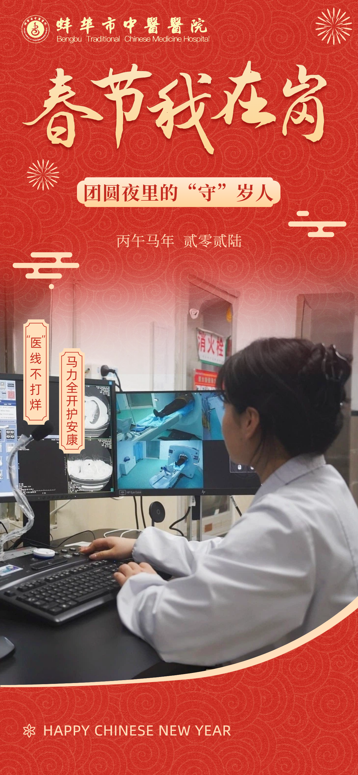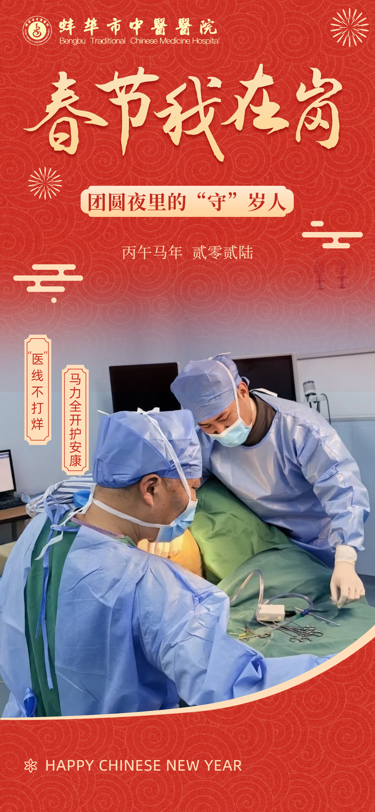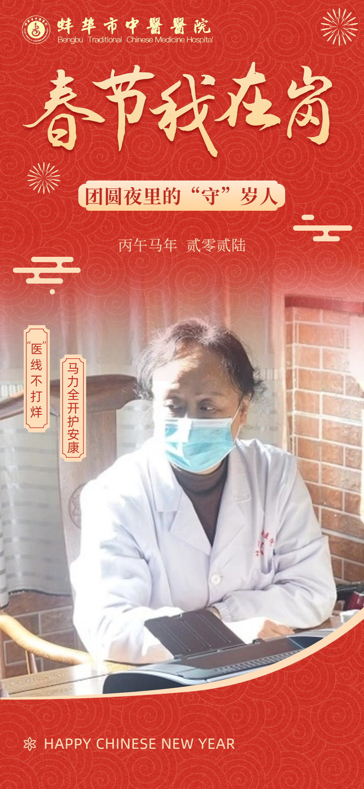 在此,向所有奋战在一线的“中医院人”致敬!愿这一份坚守,能换来千家万户的安康喜乐。祝愿全市人民在新的一年里:身体生龙活虎,生活策马奔腾,所求皆如愿,所行皆坦途,马年大吉,幸福安康!